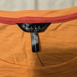 Nicole Miller Orange & Coral Short Sleeved T-Shirt Dress - Size L - NWT. It is 100% cotton. The measurements from armpit to armpit is 21 1/2 inches and from shoulder to hem is 35 1/2 inches.