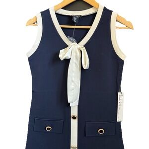 NWT Nicole Miller Sz Small Navy Blue Midi Dress Button Front Bow Tie Classy