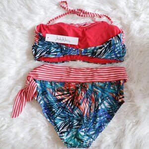 NWT Nicole Miller Red White Blue Stripe Tropical Print Bikini Bathing Suit Set