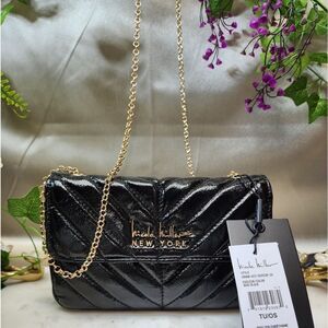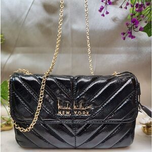 This is a beautiful black quilted crossbody bag from Nicole Miller. Bag is new with tags. The body of the bag is black with a quilted pattern on the front and top flap. The sides, back and bottom is black colored. The inside has card lots and sufficient room for the essentials for a night out. There is a gold chain that can be worn as a crossbody or shoulder bag.