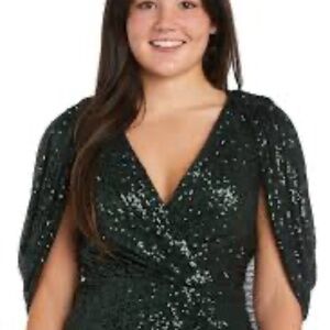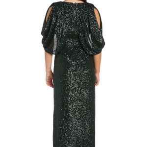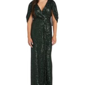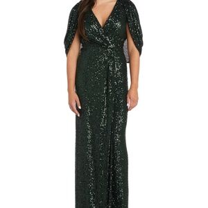 NWT Nightway Women's V-Neck Cape-Back Sequin Gown, Pine
