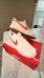 Sleek white sneakers with bold orange swoosh. Comfortable and trendy.