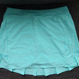 Torquise colored golf skirt/skort with pleats across the back and pockets on both sides and a zippered pocket in the back! Standard fit size Small, but could also fit a medium. Stock photos to represent the fit, but the color is the teal/greenish blue.