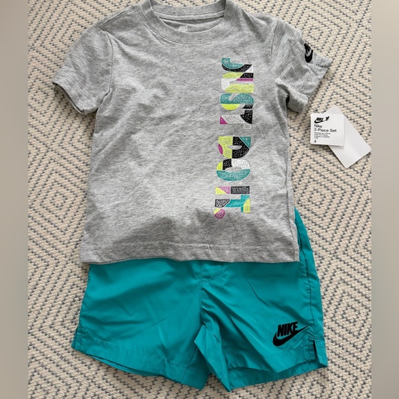 Stylish gray t-shirt with colorful logo. Teal shorts with black Nike logo. Comfortable and trendy. Fits size 3-4.