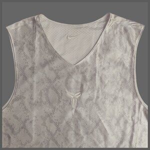 The smooth knit side features a snake skin print with the numbers 8 and 24 incorporated into the pattern. Kobe's sheath logo is embroidered at the center chest and appears on a woven tag that is stitched on near the hem. The mesh side is highlighted by a large screenprint of Kobe's sheath logo on the chest.