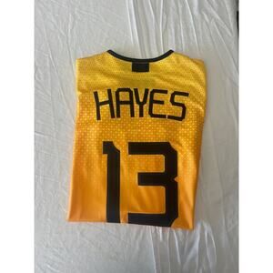 The product is a brand new with tag Nike Pittsburgh Pirates jersey featuring player Hayes in size small. This officially licensed Major League Baseball jersey is designed in the team's yellow color and is made in Guatemala. The jersey is a great addition for fans of the Pittsburgh Pirates looking to show their support for the team in style.