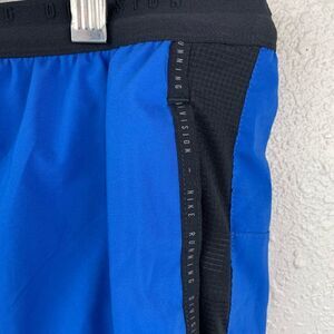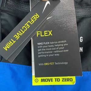 Classic pair of running shorts by Nike featuring reflective trim. They measure 18 inches at the waist laying flat and have a 5 inch seam.