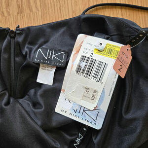 niki livas dress, black beaded cocktail dress, elegant evening dress, satin formal dress, women's partywear, size 2 black dress, fitted evening gown, spaghetti strap midi dress, classic satin dress, vintage formal fashion, luxury beaded dress, chic night-out outfit, prom dress, little black dress, high-fashion cocktail dress