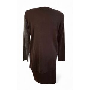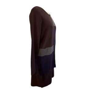 Sweater has a color block design in chocolate brown, gray and tan. Long sleeves, round neck, pullover.