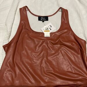 Brown,, faux leather stretchy fabric, curved squared neckline