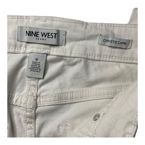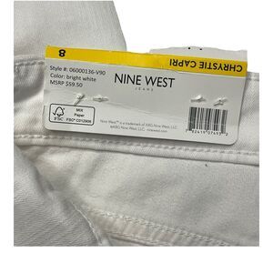 This is a new with tags (NWT) Nine West Chrystie Capri in bright white, designed for women in size 8. The jeans feature a mid-rise fit with a comfortable stretch denim fabric and a 5-pocket design including both zip and button closures. The capri style has a 23-inch inseam, making it perfect for summer and spring wear. The classic design is accentuated by button and zipper accents, along with a Nine West logo, adding a touch of sophistication to the garment.