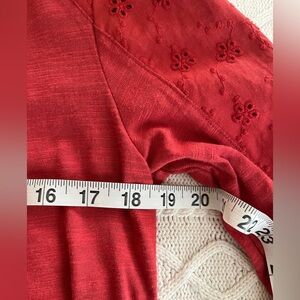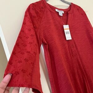 NWT brand new! Cotton/modal blend by Nine West Jeans. Pumpkin Spice color with cute patterned cut outs on sleeve. Great with jeans. Comfy. Measurements in photos! Women’s size small. Smoke free home