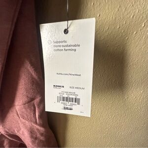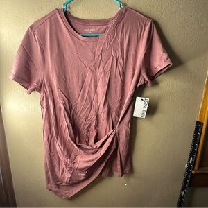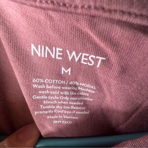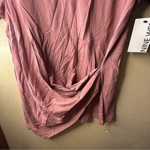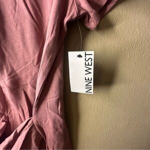 This chic pink t-shirt from Nine West features a unique asymmetrical design with a stylish tie front, perfect for adding a touch of flair to your casual wardrobe. The short sleeves and soft fabric ensure comfort and ease, making it an ideal choice for everyday wear.