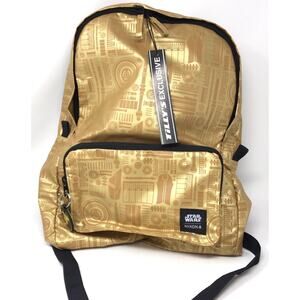 The NWT Nixon X Star Wars Tillys Gold Book Bag Backpack is a stylish and versatile accessory for both men and women. Made from 100% polyester with a geometric pattern featuring C3-PO, this medium-sized backpack is perfect for casual occasions. It comes with adjustable shoulder straps for added comfort and a zip closure for easy access. With a classic space theme and durable nylon handles, this backpack is a must-have for fans of Star Wars and collectors of unique items.