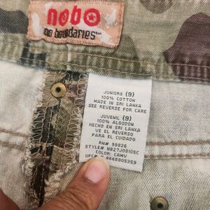 These NWT No Boundaries Capri Pants in size 9 are perfect for juniors looking for a trendy and comfortable option. Made from 100% cotton with a camouflage pattern, these cropped pants feature a zipper and button closure. Ideal for various occasions such as travel, weddings, parties, casual outings, formal events, workwear, or business meetings, these pants are machine washable for easy care. The multicolor design and regular fit make them versatile for all seasons, adding a touch of art, USA, hippie, and American-themed flair to your wardrobe.