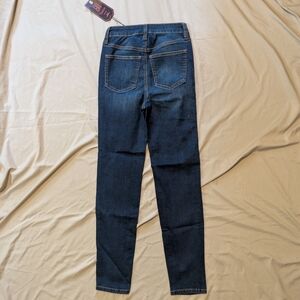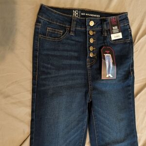 Chic high rise jeans with button fly. Dark blue wash for versatile style. Perfect for casual wear.