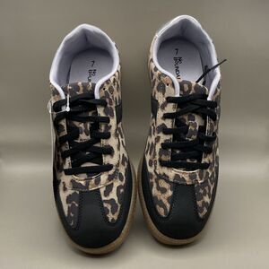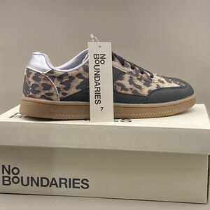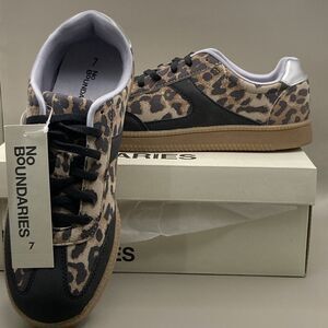 The product is a pair of NWT No Boundaries leopard and black sport sneakers for women in size 7. These athletic shoes feature a multicolor design with a trendy leopard theme, making them stylish and versatile for everyday wear. The sneakers are designed with a comfortable and trendy style, perfect for women looking to make a statement with their footwear.