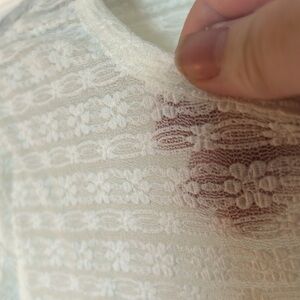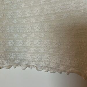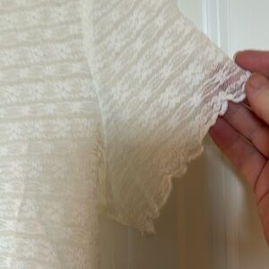 New and unworn short sleeve top is see through and made to be worn over a tank or other layering piece. Pretty flower pattern looks like lace, scoop neck style and lettuce hem, cuffs. Cream or off white color is very close to white, more like a pearl color.