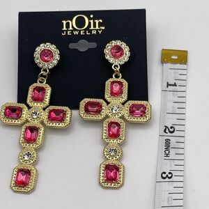 NWT Noir Jewelry Gold Toned and Pink Stone Statement Cross Earrings