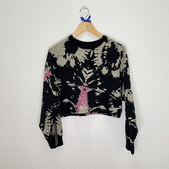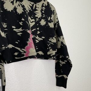 A new with tags cropped sweatshirt. A black sweatshirt with a tan accent in a tie dye design. Looks almost like it’s a bleach dye. Looks slightly over sized