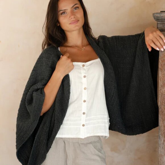 Nomad The Label Bloom Kimono Sleeve Shrug Open Front Black Raw Cotton