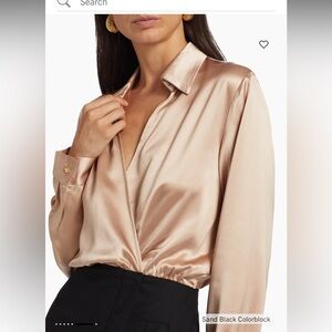 Nonchalant Label's Johanna mix media dress showcases a satin shirt bodice with a spread collar and surplice design, finished with a fitted pencil skirt.