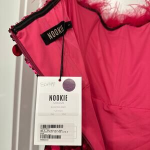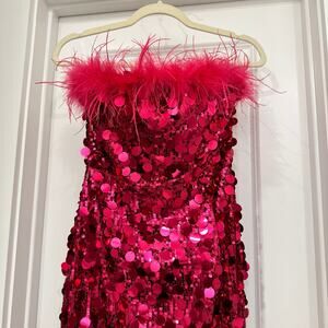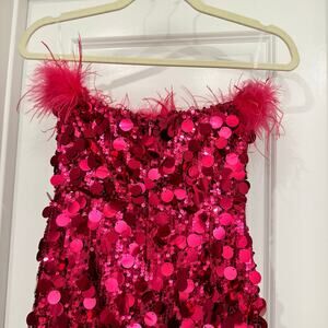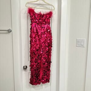 NWT Nookie Electra Feather Trim Sequin Midi Dress in Fuchsia Size Small