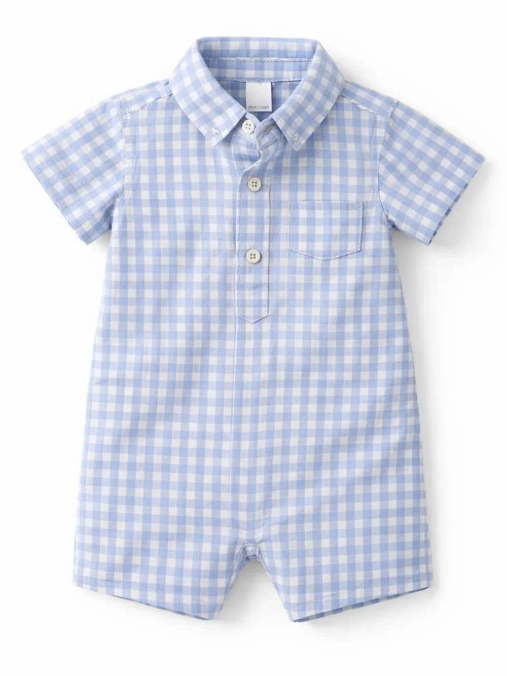 This classic one-piece features a timeless blue and white gingham print—perfect for dressing your little one in a polished yet comfy style.
