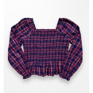 New with tags navy and red plaid smocked blouse from Nordstrom in size 10/12. Features puffy sleeves, a square neckline, ruffled cuffs and hem, and sparkly silver threading throughout. Beautiful top for the holiday season.