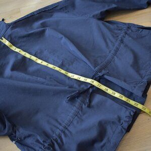 Buttoned wrists, buttoned front pockets, side-slit waist with wrap-ties.