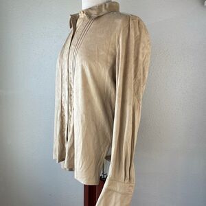 Stylish faux suede style button down top by Norton McNaughton measuring 21 inches armpit to armpit and 25 inches in length from shoulder to hem.