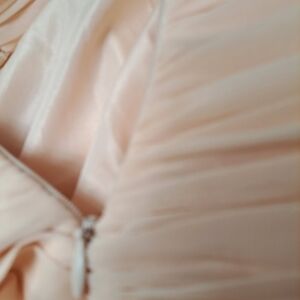 peach sheer pleated gown with matching lining, side zipper, 2" band of clear & silver sequin surround the dress & the shoulder, built in bra, pit to pit 16" length 62" comes with extra sequins