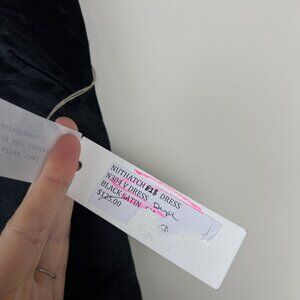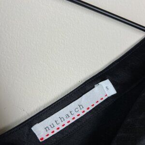 NWT Nuthatch Black Satin Silk Linen V-Neck Asymmetrical Hem Dress. Sharkbite asymmetrical hem. Sleeveless. V-neck and V back. Back zip closure. Made from natural fibers by artisans in Maine. Silk linen blend. Retail: $125. Size Small. Armpit to armpit: 17.5". Length: 35.5". (132)