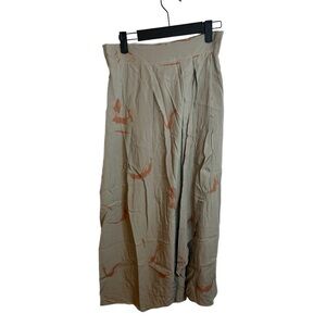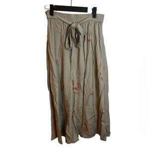 Brand new with tags. Adorable beige midi skirt with peach tie dye style detailing. This has a waist tie that ties on the back of the skirt. WOMENS size 4.