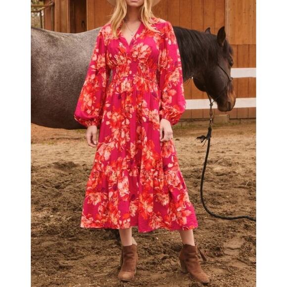 NWT ODDY Flirty Floral Ruffle Neck Midi Dress MEDIUM Flowy Balloon Sleeves NEW
