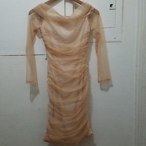 NWT OFF SHOULDER RUCHED MESH BODYCON MINI NUDE DRESS