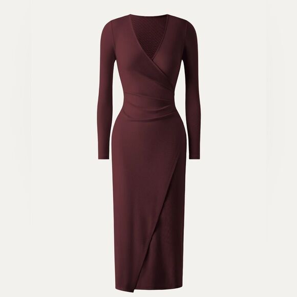 Our Surplice Wrap Midi Dress features a flattering V-shape neckline that frames your collarbone and elongates your neck. The cut is designed to emphasize your curves. The stretchy rib offers a snug, comfortable fit.