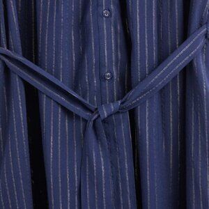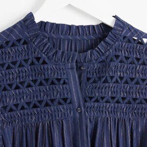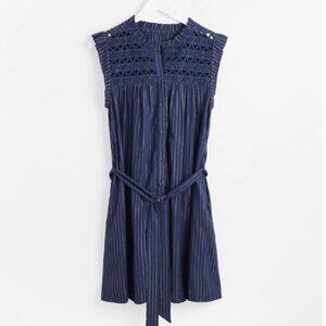 In a rich navy hue with golden stripes, this blue dress sits in a mini length with a front button up fastening. Rows of pintuck details line the neckline, with cut out elements and a frill trim.