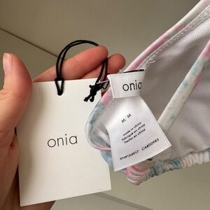 New with tags. Hygienic liner still attached. Onia white, blue and pink tie dye floral water color bikini set. Adjustable straps. Padded cups. V cut bottoms. Size medium top and bottom.