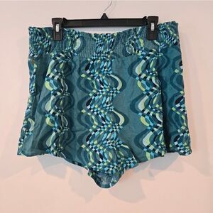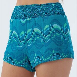 Effortlessly stylish woven short that features a colorful print design, smocked waistband and merrow hem detail.
