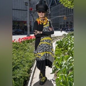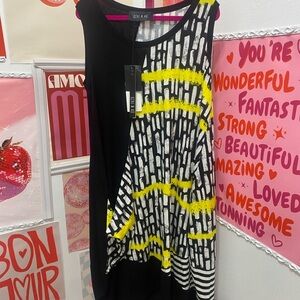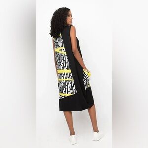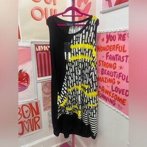 Stylish black dress with a bold yellow and white graphic pattern. Perfect for a standout look.
