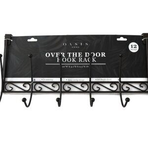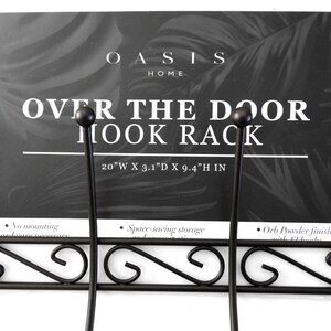 New with tags, Oasis Home black metal 6-hook over-the-door hook rack. 20"X3.1"X9.4"H.