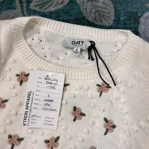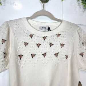 NWT Oat New York Sweater Womens Small Off White Floral Short Sleeve Cropped Knit cute cottagecore rosette embroidered knit top