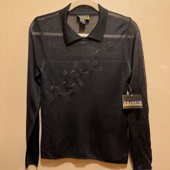 Objects Gold collared black blouse with gold leaf motif embellishment