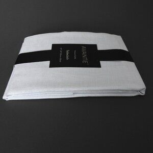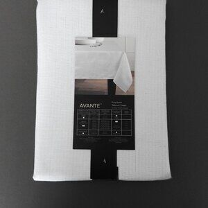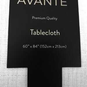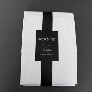 New with tags, Avante oblong white tablecloth with silver metallic threading. Premium quality. 100% polyester. 60" wide and 84" long. Any occasion. Classic elegance. Machine wash separately in cold water. No bleach, tumble dry low.