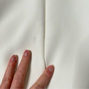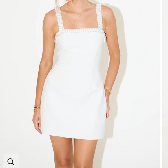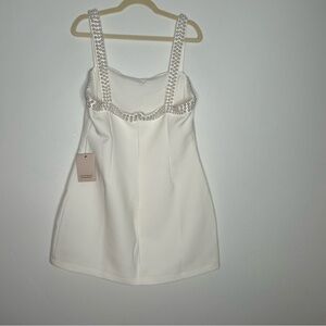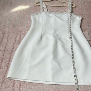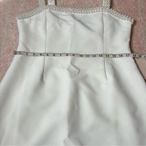 New off white mini dress with faux pearl trim at bust and on straps. Small dark spots near bottom of zipper, may come out if treated.