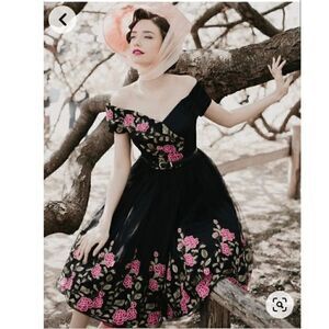 🌸 NWT Off Shoulder Retro Pinup Vintage 1950s Mesh Floral Embroidered Dress XL
