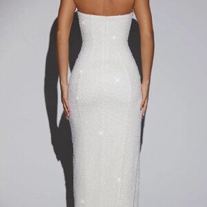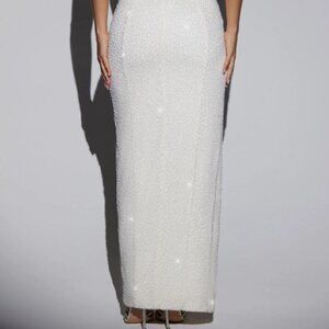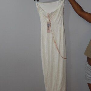 Never Worn. New With Tags. Oh Polly La Rochette Embellished Bandeau Cowl Neck Maxi Dress in Ivory. This maxi length dress is embellished with pearl and bead adornment with a thigh high split and bandeau neckline with cowl neck draping. Hidden zipper on reverse and tight cut for bodycon fit. US size 6/ UK size 10. Fits a US 4/6