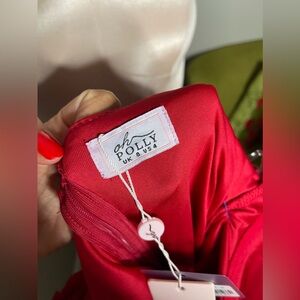 NWT, does have a small flaw near bust/armpit that cannot be seen when worn (see photo). Mesh overlay, bell frill sleeve. Back zipper with hook closure. Material does stretch.