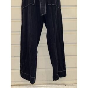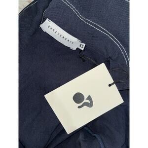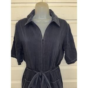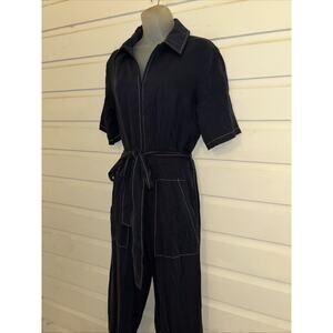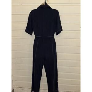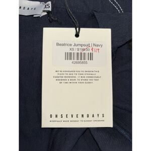 Brand new and never worn Oh Seven Days solid navy blue short sleeve Beatrice jumpsuit. Features pointed tip fold down collar and plastic zip closure at center front. Straight cut short length sleeves. Removable tie style belt at natural waist. Pockets at front thigh. Straight cut through leg length, falling to top of ankle. Visible white stitching throughout. Medium weight fabric without stretch available. Women’s size extra small with 40” bust measurement, 34” waist, 40” hips and 27.5” inseam. Never worn. Tag still attached. MSRP $198, purchased on sale for $119